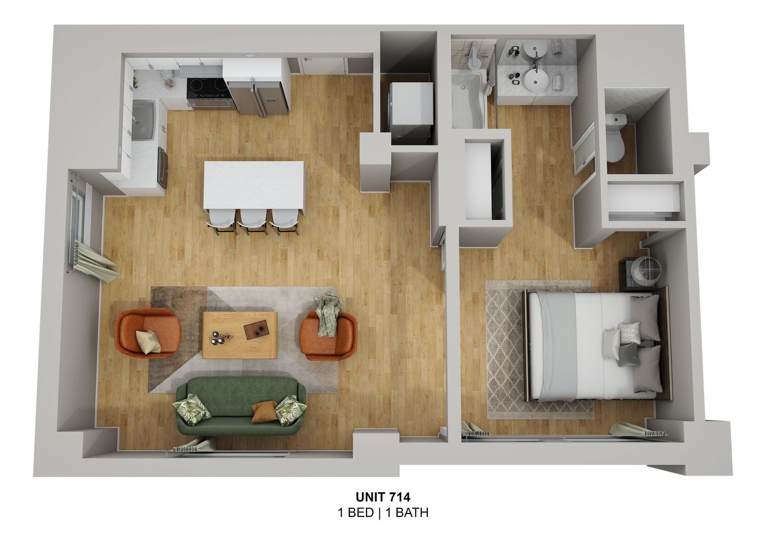 Enjoy access to premium amenities including a rooftop deck with skyline views, fitness center, saltwater pool, resident lounges, and dog run.