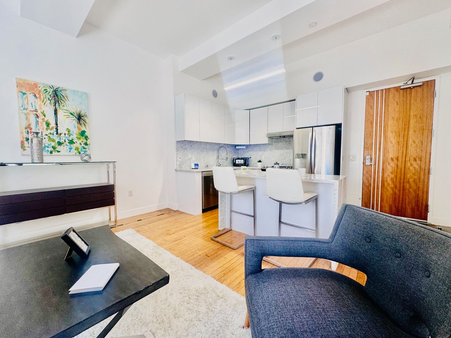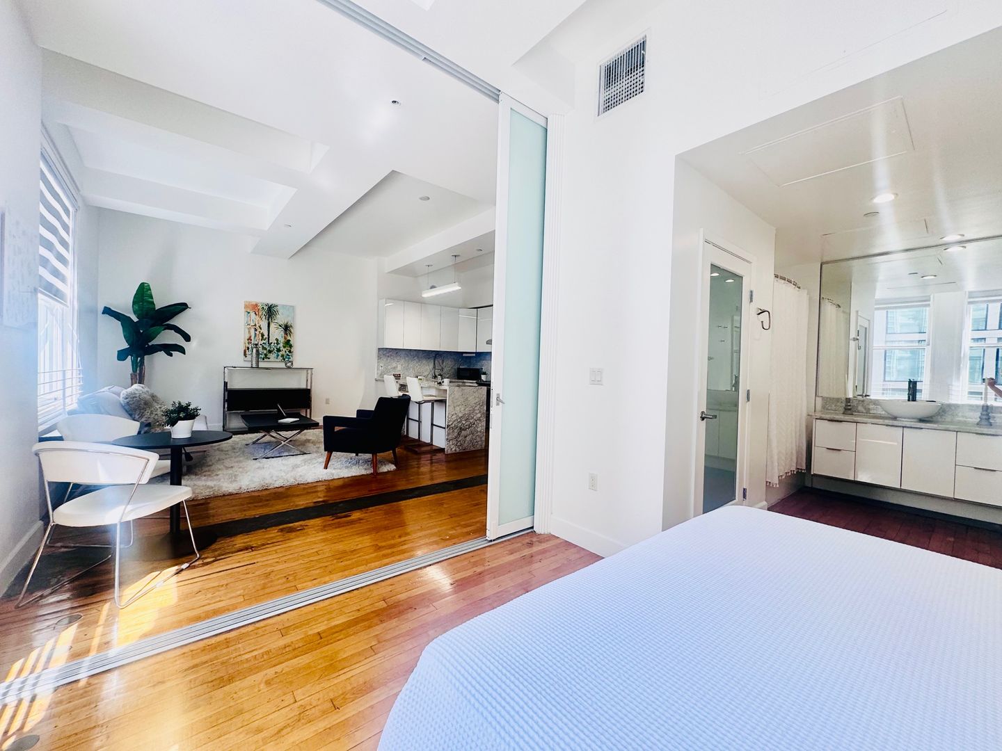 Welcome to the Gorgeous Corner One Bedroom, a stunning apartment located in the heart of Los Angeles, CA. This apartment boasts a spacious bedroom and a full bathroom, offering a perfect blend of comfort and style. The interior features hardwood floors, high ceilings, and oversized windows that flood the space with natural light. The modern kitchen is equipped with a dishwasher and the convenience of an in-unit washer and dryer. The apartment is also tech-friendly, featuring Google Home and Bluetooth speakers for a seamless living experience. The building's amenities are designed to enhance your lifestyle. Enjoy a refreshing dip in the saltwater pool, stay fit in the well-equipped gym, or take your furry friend to the dog run. The lounges with fire pits provide a perfect setting for relaxation or socializing. The rooftop amenity deck offers a unique space to unwind and enjoy the city views. This apartment offers a luxurious living experience in a prime location.