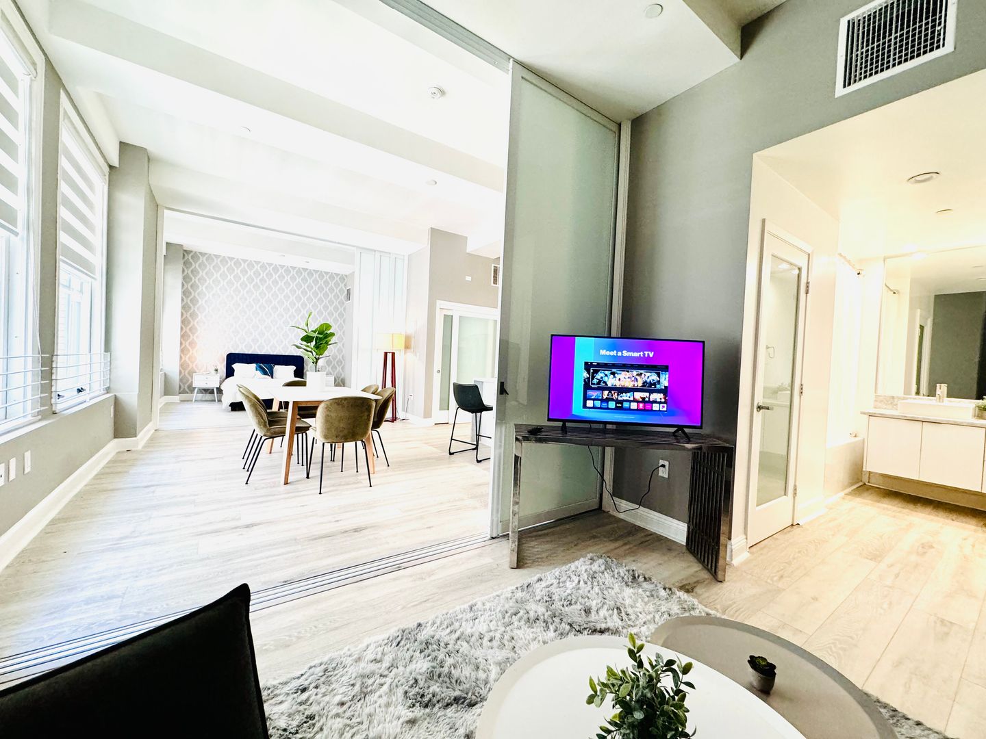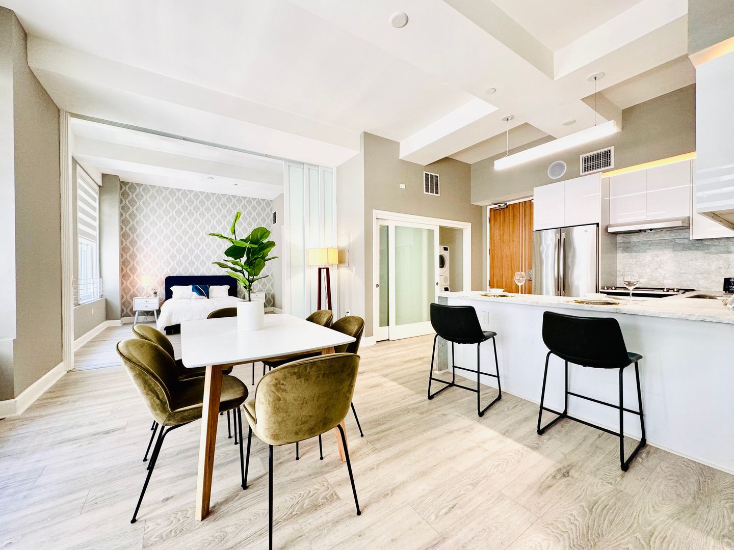 Experience the epitome of modern living in this stunning 2-bedroom, 2-bathroom apartment located in the heart of Los Angeles, CA. This apartment boasts high ceilings and hardwood floors, creating a spacious and elegant atmosphere. The oversized windows allow for an abundance of natural light, enhancing the overall aesthetic of the space. The kitchen is equipped with a dishwasher, making clean-up a breeze after entertaining guests. The apartment also features an in-unit washer and dryer for your convenience. For the tech-savvy, the apartment comes with built-in Bluetooth speakers, perfect for setting the mood with your favorite tunes. When it's time to unwind, take a dip in the saltwater pool or relax in one of the lounges equipped with fire pits. Fitness enthusiasts will appreciate the on-site gym, eliminating the need for a separate gym membership. Pet owners will be thrilled with the dog run, providing a safe and fun space for your furry friends to play. This apartment offers a blend of comfort, style, and convenience, making it the perfect place to call home.